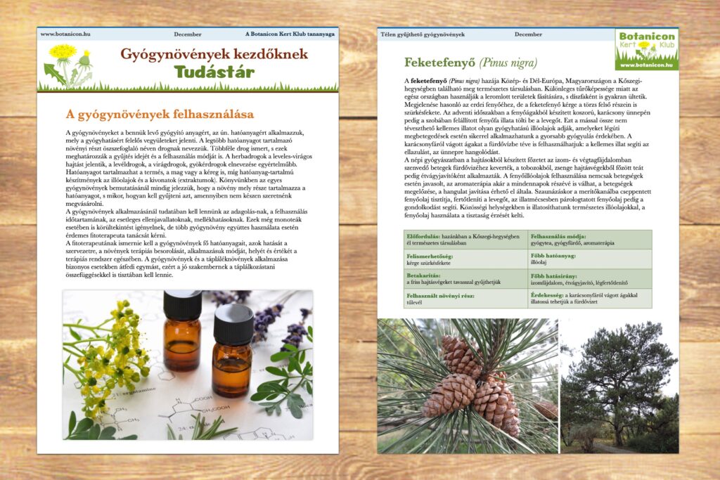 Herbárium: havonta négy gyógynövény részletes bemutatása, felhasználási lehetőségei, fellelhetősége. Egy év alatt 48 gyógynövény ismerete, olyan tudás, amit a saját életedben és a szakkörön/táborban is fel tudsz használni. Havi kihívások a tananyag gyakorlása végett, és kirándulás ajánló: gyógynövényes helyszínek bemutatása (pl. arborétum, tanösvény).